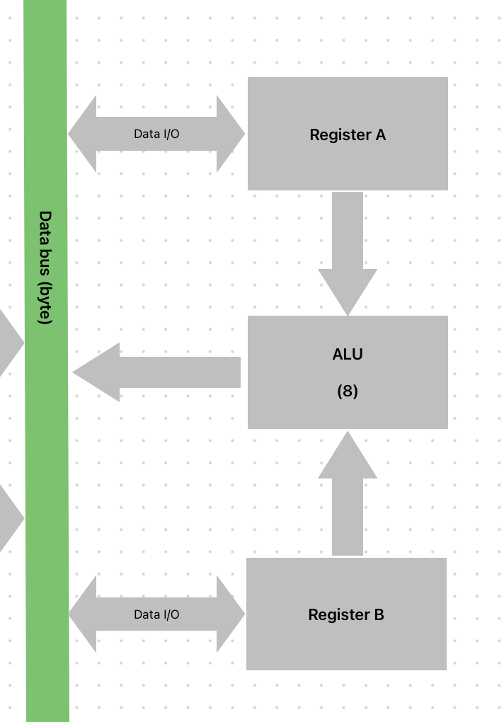 In our design, Register A and B are used to store the two values for addition and subtraction operations. The ALU currently only supports addition and subtraction, but we can employ some clever tricks to implement other functions, such as bitwise shifts.